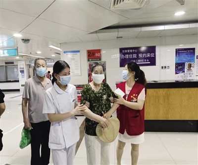穿梭于门诊部各个楼层,随处可见工作人员,从门诊大厅的一站式服务中心到电梯口,从诊室门口到住院办理处,从缴费窗口到取药窗口……工作人员的身影无处不在。搀扶行动缓慢的老年人,推送坐轮椅的老年人,帮助迷路的老年人……在门诊大厅里,他们是眼神最“活”的人,也是步伐最快的人,让老年人少跑路,少等待,享受便捷的就医体验。