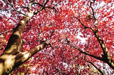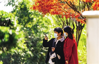 南湖公园“枫”景如画。12月14日,天气晴朗,市民在南湖公园枫叶林中游玩拍照。时下,公园内的枫叶正红,在阳光的映照下如团团火焰、璀璨彩霞。