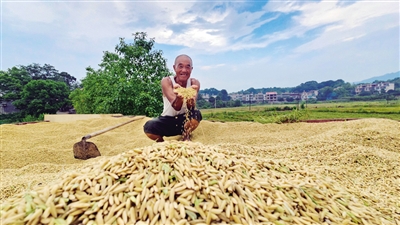8月20日,湖南省常宁市板桥镇西洞村农民展示刚收获的稻谷。时下,各地农民抢抓农时忙收获。■新华社发