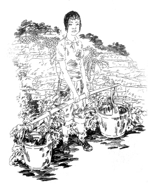 过去那年代农村生活条件相当艰苦,自来水更是乡下人的奢望。处于生活用水的需要,各家各户都备有水桶去室外挑水,挑水也是当年孩子们承担的家务劳动之一。