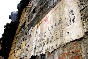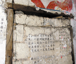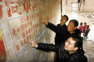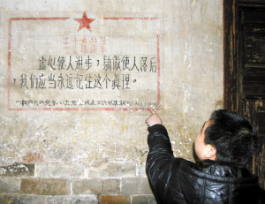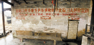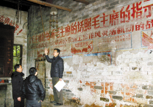 在走访时,我们发现,一座民国初期的合院建筑部分已被拆除,残留部分的墙面上,上世纪五十年代的宣传墙报非常精美。我们对随行的村支书说,这些红色文化遗迹,堪称文物,应该保存下来。村支书答应与有关部门协商,争取留下来。不远处,正在开发一个上规模的农家休闲庄园。有人感叹:如果村里的这些老建筑和红色文化遗迹得以保存,与开发农家乐两全其美,该有多好呀!