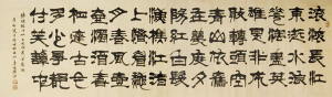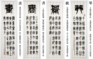 在与李先生讨论这幅新的篆书作品闲余,李先生与我谈起了他的身世。李先生七岁的时候就开始学习书法,出于对书法的热爱,一直到今未曾中断。李先生擅长篆、隶、行、楷、草等各类书体,但他特别喜欢隶书、篆书和篆刻。文革时,远近的单位都找他写大字报,写的都是楷书、隶书,改革开放后,生意人多了,登门求字写店面招牌的特别多。九十年代他的书法作品就已在各级举办的书法大赛多次得过金奖,先后被湖南省书画家协会、美国中国画院等协会团体聘为会员。篆书、隶书作品被很多企业、博物馆、收藏家和海外人士收藏。