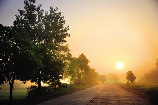 昨日清晨6时14分,常宁柏坊镇桐梓乡红泥村的公路上,一辆货车缓慢行驶在晨雾中。当日,衡阳地区普遍遭遇大雾。气象部门预计,这场大雾将给衡阳带来持续几天的晴好天气。 ■王亲民 摄