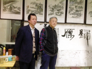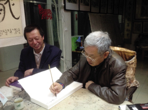 吴颐人先生久负盛名,艺播海内外。接书法报陈先生的电话,知吴先生要来衡阳,请我接洽,我不免有些紧张。但见到吴先生后,我的拘谨烟消云散。吴先生温文尔雅,平易近人,风趣幽默,有一见如故之感。在我的工作室,见到一支使用过后没清洗、笔尖变硬的毛笔时,他打趣地说“你这支笔可以作利器啦!”看到我的画毡上墨迹斑斑,他幽默地说:“你这个画毡包浆很多,看来用功甚勤啊!”并笑着对我妻子说:“这跟你这个艺术总监有关咯!”他的话语不时引得大家笑起来,气氛非常活跃轻松。