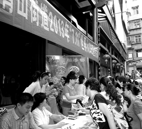 “7.11”是世界人口日,昨日上午,石鼓区青山街道易赖街大市场流动人口计生协会在市场边开展宣传活动,现场人头攒动。 当天,该协会与辖区医院合作,打出宣传活动“组合拳”:为市民们提供义诊、赠送计生药具、给流动人口现场办证,同时展出婚育政策板报,发放宣传手册等,吸引了众多市民的关注。 ■易成章 徐蔚 摄