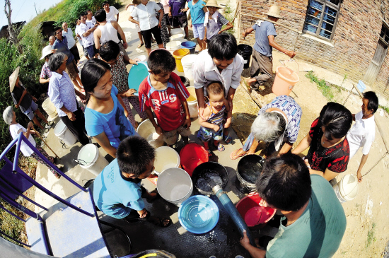 持续晴热高温,造成部分老百姓生活用水困难。昨日,祁东县组织环卫车辆为蒋家桥镇村民送水。 ■新华社发