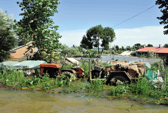 8月26日,在黑龙江抚远县生德库村,村民来不及带走的农机和家禽被倒灌的江水包围。 ■新华社发