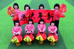 2015年12月31日,四川省遂宁市遂州外国语小学国学班的孩子们展示大红灯笼、猴年挂饰等新年吉祥物,迎接新年的到来。■新华社发