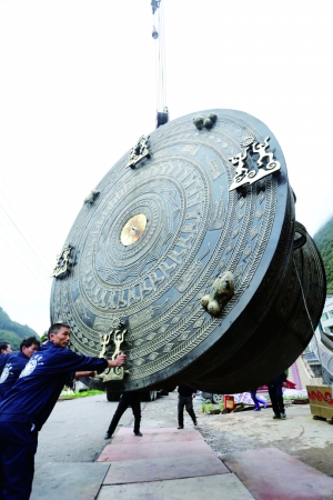 1月10日,铜鼓铸造厂工人在吊装制作好的大铜鼓。