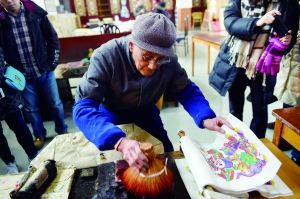 1月24日,朱仙镇木版年画传承人郭太运在河南开封博物馆的工作室内制作年画。