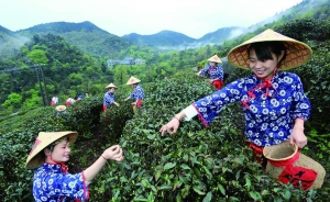 南岳祭茶大典活动期间,采茶女正在采茶。