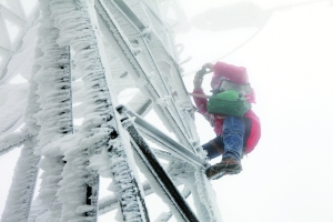 近日,受“霸王级”寒潮的影响,国网衡阳供电公司启动了防冻融冰三级预警。从1月20日开始,国网衡阳供电公司在常宁市天塘山观冰点安排了固定冰情监测哨,运维五班4名观冰巡检人员就在这里24小时坚守值班。每隔规定时间,观冰工作人员都要带着风速仪、温度仪、卡尺等测量工具,在风雪中艰难步行1个小时来到观冰点,开展观测工作,并向公司防冻融冰指挥部报告上述数据。图为观冰人攀上铁塔除冰。 ■彭智勇 摄