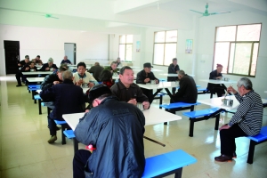 谭子山镇敬老院的老人坐在宽敞明亮的餐厅里,尽情享受午餐。