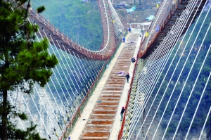 1月27日,备受关注的张家界大峡谷人行玻璃桥正式开始桥面玻璃铺设工程,预计两周内完成全部玻璃铺设。张家界大峡谷玻璃桥桥面由三层玻璃叠加而成,共99块,整个玻璃面的承载量至少达60吨。据悉,张家界大峡谷玻璃桥总长430米、宽6米,桥面距离谷底相对高度约300米。桥面全部采用透明玻璃铺设,最大游客容量为800人。图为俯瞰张家界大峡谷玻璃桥桥面玻璃铺设施工现场。
