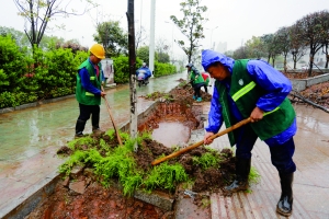 园林工人冒雨“破硬还绿”