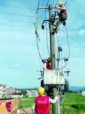 洋泉供电所党员服务队冒着烈日抢修10千伏洋杉线052杆线路,确保百姓用电。