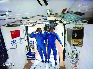 景海鹏(左)和陈冬在天宫二号实验舱向全国人民问好并敬礼。 ■新华社发
