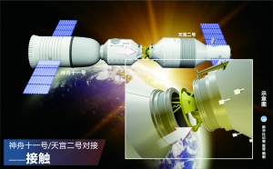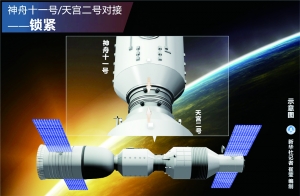 经北京航天飞行控制中心就对接准备状态进行最终确认,神舟十一号开始向天宫二号缓缓靠拢。3时24分,神舟十一号与天宫二号对接环接触,在按程序顺利完成一系列技术动作后,对接机构锁紧,两个飞行器建立刚性连接,形成组合体。