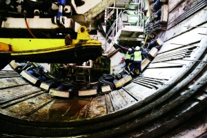 据了解,此次进行的盾构法施工的原理是,使用盾构机一边控制开挖面让周围土体不发生坍塌失稳,一边进行隧道掘进、出渣,并在机内拼装管片形成衬砌、实施壁后注浆,从而不扰动周围土体而修筑隧道。盾构机的 “盾”,是指保持开挖面稳定性的刀盘和压力舱、支护周围土体的盾构钢壳,所谓“构”,是指构成隧道衬砌的管片和壁后注浆体。