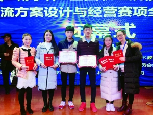 在近日举办的第九届“畅享杯”全国职业院校创业技能大赛物流方案设计与经营赛项上,湖南财工院现代物流系代表队在100支参赛队伍中脱颖而出,以优异成绩荣获全国二等奖。图为获奖学生和指导老师在颁奖现场合影。