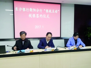 本报讯(文/图 记者 张建新)1月25日上午,长沙银行衡阳分行与市国税局、地税局举行“银税互动”合作签约仪式,携手助力中小微企业融资。