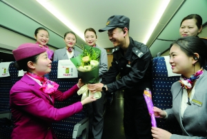 当日是“三八”妇女节,在南昌铁路局南昌客运段南昌西发往上海虹桥的G1390次列车上,女乘务员和乘坐列车的女性旅客不仅收到了慰问鲜花,乘务员们还自编自导了小节目,在工作岗位上度过一个快乐的节日。