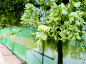 本报讯(记者 胡亚华)花开似鸟飞,花白泛绿丛。昨日下午,在西湖公园南大门附近,记者看见龙爪槐花开正艳,花的形状似白色鸟雀俏立枝头,景致优美。