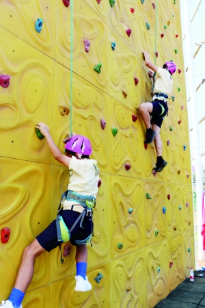 高达十余米的户外攀岩墙分为女士道、男士道和勇士道,飞虎队的邓恩宏同学第一个成功挑战了男士道,现场的童军们给予了他热烈的掌声和欢呼声。