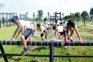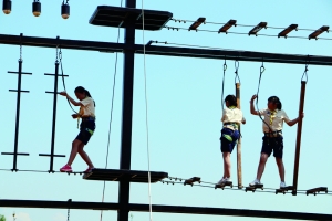在高空极限挑战项目中,虽然有安全绳的保护,但脚下摇摇晃晃的铁索桥和绳圈也不是一般胆量的人能征服的。童军们在教练的鼓励下勇敢战胜了心中的恐高畏难情绪,全部闯关成功。