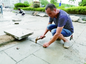 12日下午,在高新区华新大道与天台路交汇处,记者看见数名施工人员正在搅拌水泥混凝土,人行道上破烂的道板砖堆积如山,一名施工人员在刚浇筑好的水泥“补丁”上压线条,起到装饰美化作用了。施工队左姓负责人告诉记者,反复维修补道板代价太大,利用水泥混凝土替代火烧板,尽管欠美观整齐,但可承受车辆碾压,避免频繁更换。