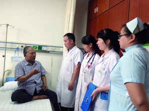徐爷爷高兴地和帮助过他的医生、护士分享他的喜悦