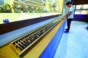 山西一家商铺内,用于展示的巨型算盘引人注目。这个算盘长6米,可供20人同时算账。