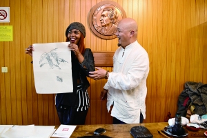 10月20日,联合国教科文组织工作人员(左)在法国巴黎展示其亲手拓印的作品。