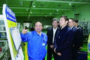 市国税局党组书记、局长李立平(中)陪同省国税局党组书记、局长刘明权(右一)到湖南机油泵股份有限公司调研