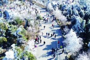 近日,受强冷空气影响,素有“神州之南最佳赏雪处”的南岳出现雾凇景观。洁白的雾凇在蔚蓝的天空映照下,散发出晶莹的光芒,将雾凇之美演绎到了极致,吸引中外游客纷至沓来。据不完全统计,12月16日—17日来南岳游客近3万人次。