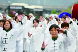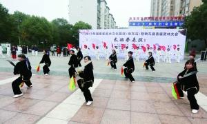 上午9时,古朴、悠扬的音乐响起。南岳衡山派传统武术研究会、衡东少林文武学校表演的《琴剑合璧》仗剑起舞。辗转腾挪,剑花飞出,如落英缤纷。这人剑合一的功夫,让人想起《笑傲江湖》中的衡山派掌门莫大先生,琴中藏剑,剑发琴音。太极是强筋健体、修心养性最好的体育运动项目。该县太极拳协会一百人在飘飘细雨中打着太极,表演《群芳争艳》。衣袂在清风中飞扬,带起串串珍珠般的雨滴,动作舒缓柔和,形象优美,意境悠远,赏心悦目。记者在现场看到,各路武林豪杰齐聚一堂,尽显武林绝技。一招一式彰显五千年的中华文化,南岳开山拳章法灵动,气势磅礴;南岳扫把功身灵步巧,攻势凶猛;衡山剑法潇洒飘逸,变幻莫测。