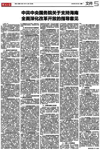 中共中央国务院关于支持海南 全面深化改革开放的指导意见