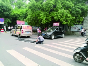 5月22日上午,记者在岳屏公园东大门旁看到,一辆黑色越野车和一辆面包车泊靠在人行道旁,两辆车顶上均安装了防水补漏广告牌,一名中年男子在马路上铺展油毛毡,全然不顾身旁穿梭而过的车流,一名中年妇女高举专业防水广告牌四处揽客。附近居民介绍,这些任性乱停,有时连排停靠在非机动车道上,有时停靠在公园大门口。利用车辆做广告博人眼球,挤占公共通道影响正常通行。