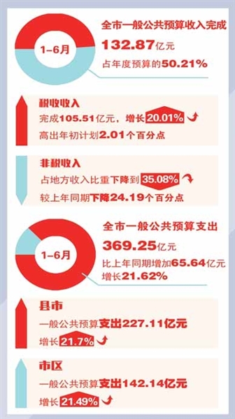 1—6月,全市一般公共预算支出369.25亿元,比上年同期增加65.64亿元,增长21.62%。其中:县市一般公共预算支出227.11亿元,增长21.7%;市区一般公共预算支出142.14亿元,增长21.49%,其中市本级一般公共预算支出64.96亿元,增长18.1%。