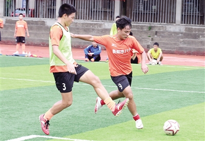 8月6日上午,南华大学足球场上,代表我市征战省运会的男足甲组足球队员们正在绿茵场上挥汗如雨。据了解,本次省运会上,我市共派出115名足球队员分别参加青年组(男足甲乙两组、女足甲乙两组)和成年男子组比赛。 ■王翟 摄