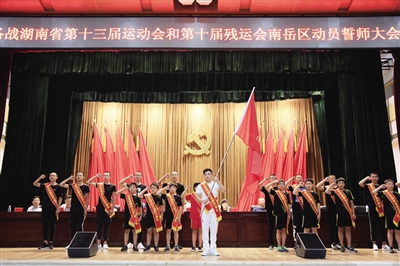 本报讯 (记者 刘思远 通讯员 文兰)“我们向着祝融峰和家乡人民庄严宣誓:作为祝融的传人,我们将燃烧火的激情、昂扬火的斗志,厉兵秣马,披荆斩棘,决战本届省运会,以优异的成绩向家乡人民献礼!”8月2日,南岳区召开湖南省第十三届运动会和第十届残运会誓师大会,2018全国青年举重锦标赛冠军刘扬带领参赛健儿面对祝融峰方向庄严宣誓。