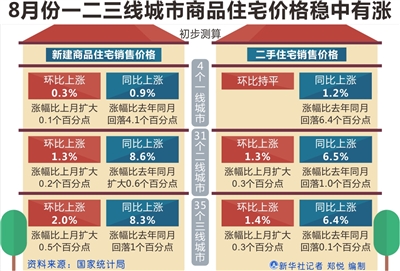 8月份,各地继续坚持因地制宜、因城施策、综合调控,努力促进房地产市场平稳健康发展。据国家统计局初步测算,4个一线城市新建商品住宅销售价格环比上涨0.3%;同比上涨0.9%,涨幅比去年同月回落4.1个百分点。二手住宅销售价格环比由上月上涨0.2%转为持平;同比上涨1.2%,涨幅比去年同月回落6.4个百分点。