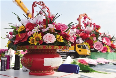 天安门广场“祝福祖国”巨型花篮组装现场摆放的花篮小样(9月20日摄)。 目前,天安门广场花坛布置工作正在紧张进行,“祝福祖国”巨型花篮也渐现雏形。据了解,从2011年开始,“祝福祖国”巨型花篮就一直作为天安门广场中心花坛在国庆节期间向祖国献礼。根据今年的花卉布置方案,广场中心花坛仍以花篮造型为主景,花篮为钢架结构,可抗10级风;花坛顶高17米,篮盘直径15米,花坛底部直径50米。花篮里将布置有红掌、梅花、康乃馨、向日葵、兰花、月季等多种仿真花卉,寓意幸福吉祥。 ■新华社发