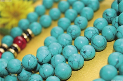 绿松石更多地用于藏式佛珠中,因为藏族人民偏爱绿松石。绿松石做成的桶珠在藏式佛珠中搭配十分协调而且有宗教的味道,并且其颜色和质感能够随着长时间的佩戴而变得古朴和润泽。