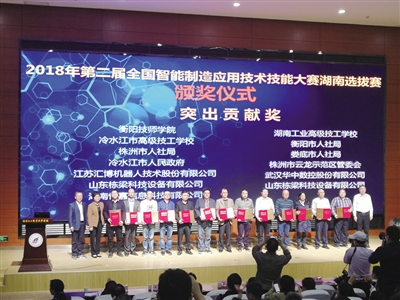 本报讯 (文/图 记者 李建平 通讯员 唐孟贤) 记者昨日从市人社局获悉,在近日闭幕的第二届全国智能制造应用技术技能大赛湖南选拔赛上,我市参赛团队再创佳绩:共6组选手参赛且全部获奖,其中一等奖2组,二等奖2组,三等奖2组;衡阳市人社局、衡阳技师学院被授予“突出贡献奖”。