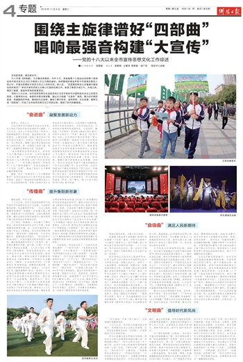 党的十八大以来,全市宣传思想文化战线坚持以习近平新时代中国特色社会主义思想为指导,认真贯彻中央、省委和市委决策部署,通过大力构建“大宣传”格局,着力讲好衡阳故事、传播衡阳好声音,围绕时代主旋律,奏响了意识形态、宣传思想、文化发展、精神文明“四部曲”,开启了全市宣传思想文化工作新征程,唱响了时代的最强音。
