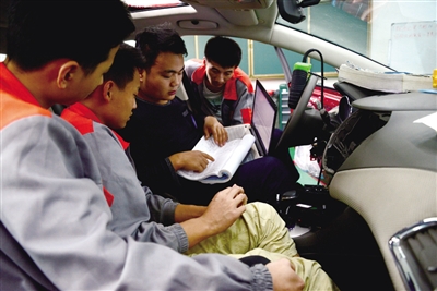 11月5日,衡阳技师学院学生在实训车间对一台轿车的空调电路进行检测。 近年来,该学院不断调整适应时代需求的热门课程,扩充和更新实训车间设备,收到了明显成效。毕业生得到了企业的认可,就业率连年攀升。■记者 陈太仰 摄