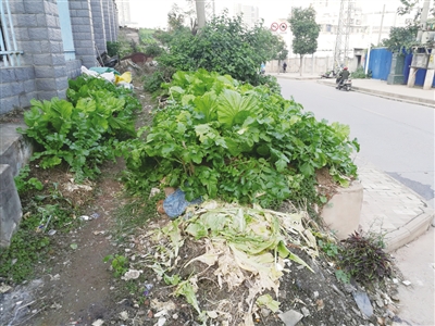 11月11日下午,记者在衡祁路湘衡兴苑旁看见,紧邻居民小区大门旁的荒坡闲地内,连片栽种了白菜、萝卜及生菜等蔬菜,菜地四周堆放着各式瓶罐及木桶,菜地旁堆放着塑料袋、碎木材及菜叶等垃圾,环境脏乱。