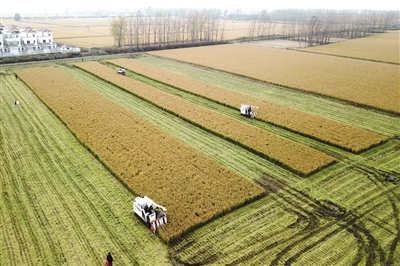11月13日,在江苏省淮安市洪泽区东双沟镇,农民驾驶农机在田间收获水稻(无人机拍摄)。 近日,江苏省多地晚稻迎来收获季,当地农民抢抓晴好天气,确保水稻颗粒归仓,田间地头一片繁忙景象。 ■新华社发