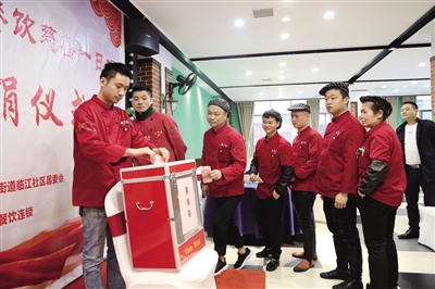 11月12日,为更好地帮扶弱势群体,助力脱贫攻坚,珠晖区广东路街道组织辖区爱心餐饮企业开展“慈善一日捐”活动。图为餐饮企业天下客员工正在捐款。